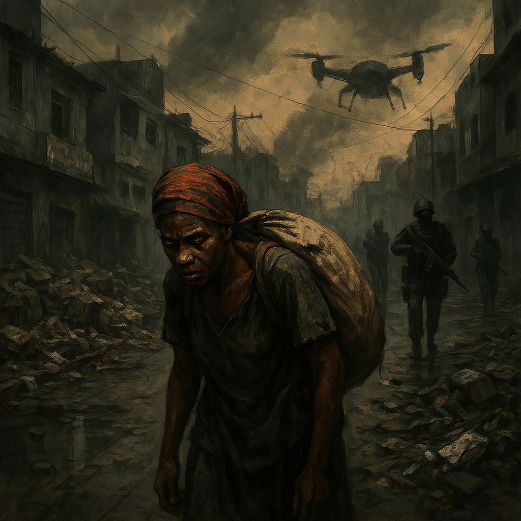 Port-au-Prince is burning again. Not with the fire of revolution, but with the scorched-earth policy of empire in a new costume—cheaply stitched together from the scraps of old colonial uniforms and Silicon Valley’s latest spyware. Over one million Haitians have been displaced—torn from their homes not by a natural disaster, but by an unnatural one: paramilitary gangs acting as subcontractors for the global hyper-imperial order.
