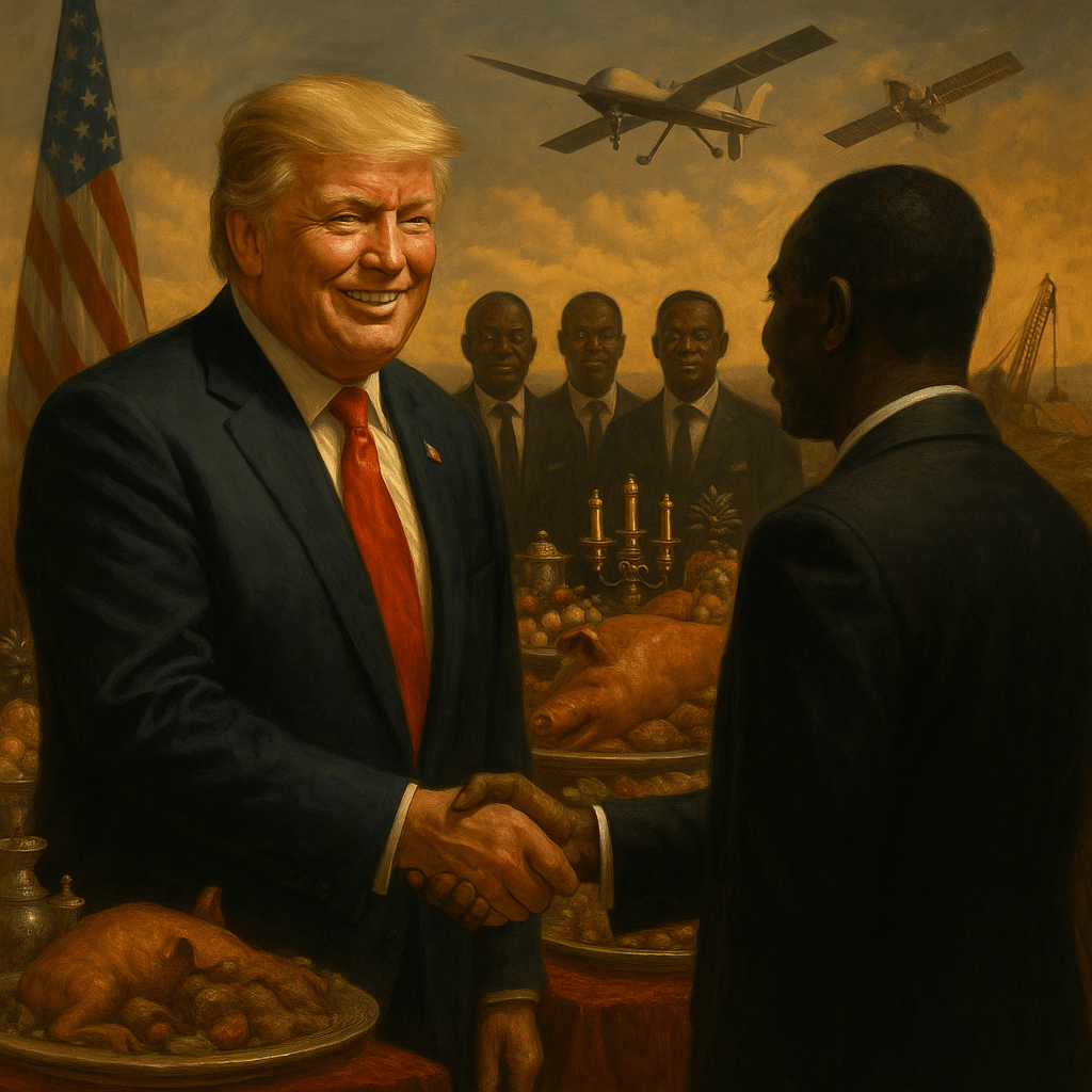 The imperial press has always known how to dress a wolf in a tuxedo. And so, when NPR’s Jewel Bright reported on Donald Trump’s three-day “mini summit” with five West African heads of state, we got all charm and no chains. The article, published July 9, 2025, casts the summit as a diplomatic triumph: deepening “commercial opportunities,” pivoting “from aid to trade,” and winning African applause for Trump’s leadership—and, bizarrely, his golf game. But beneath the diplomatic linen lies a familiar script: a U.S. president praising Africa’s “great minerals” while quietly brokering new coercive frameworks for control.