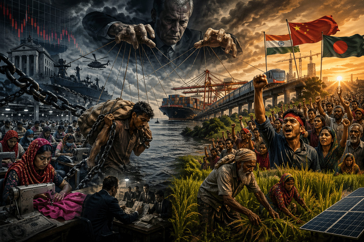Yet even in what it gets right, the article presents only a flattened version of reality. It gestures toward Bangladesh’s position between major powers but does not fully name the structure of that position. In practice, the country operates within a dual economic dependence in which exports flow primarily toward Western markets while the inputs that make those exports possible—machinery, textiles, chemicals, industrial components—are overwhelmingly tied to China, a relationship documented across regional economic reporting and Bangladeshi business coverage. This is not balance in the abstract; it is integration into two different poles of a single global system, one that consumes Bangladesh’s labor and supplies its production inputs in a tightly coupled circuit.
