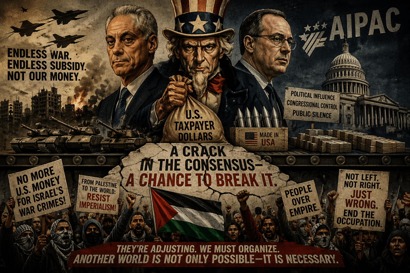 The first task is clarity. The issue is not simply “aid” in the abstract, nor is it reducible to a moral preference about foreign policy. It is about the material relationship between U.S. power and a militarized state that has functioned as a forward extension of that power. That means the struggle cannot be confined to symbolic protest or episodic outrage. It must be directed toward the concrete mechanisms through which that relationship is reproduced: appropriations, weapons transfers, legislative authorizations, and the political funding networks that discipline Congress into compliance.